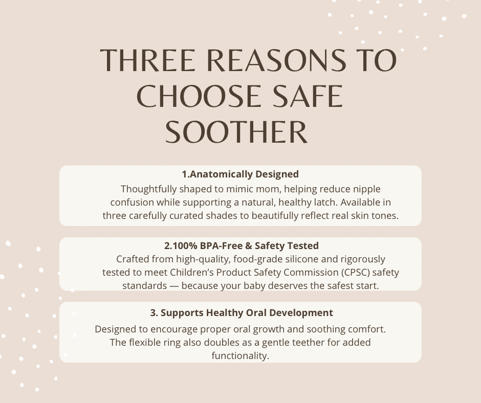 Safe Soother was created with breastfeeding mothers in mind. It is an anatomically correct pacifier designed specifically for breastfed babies. It was created to minimize nipple confusion and support healthy oral development.